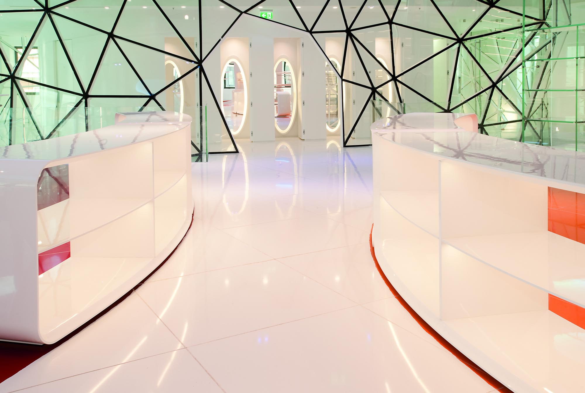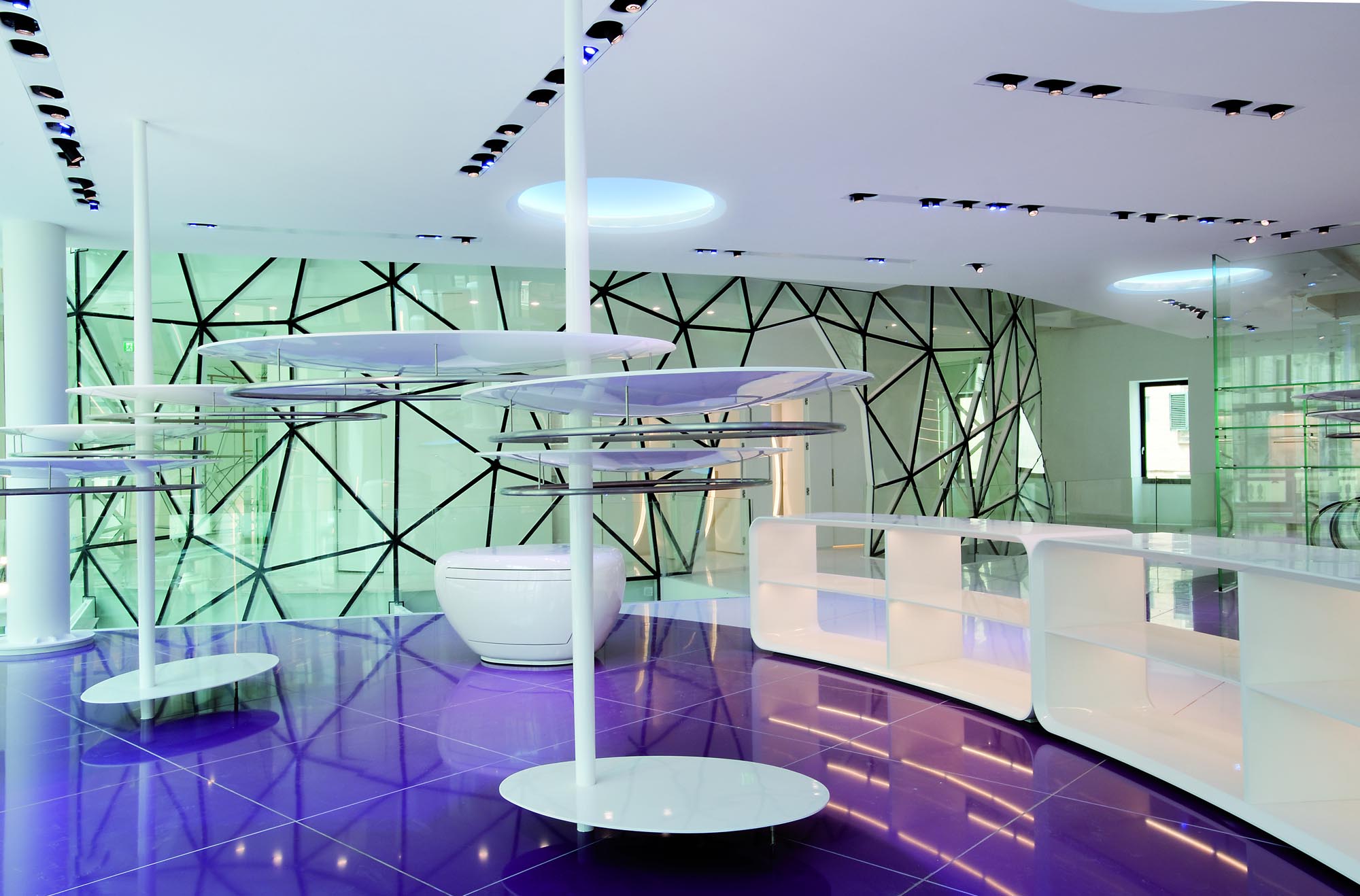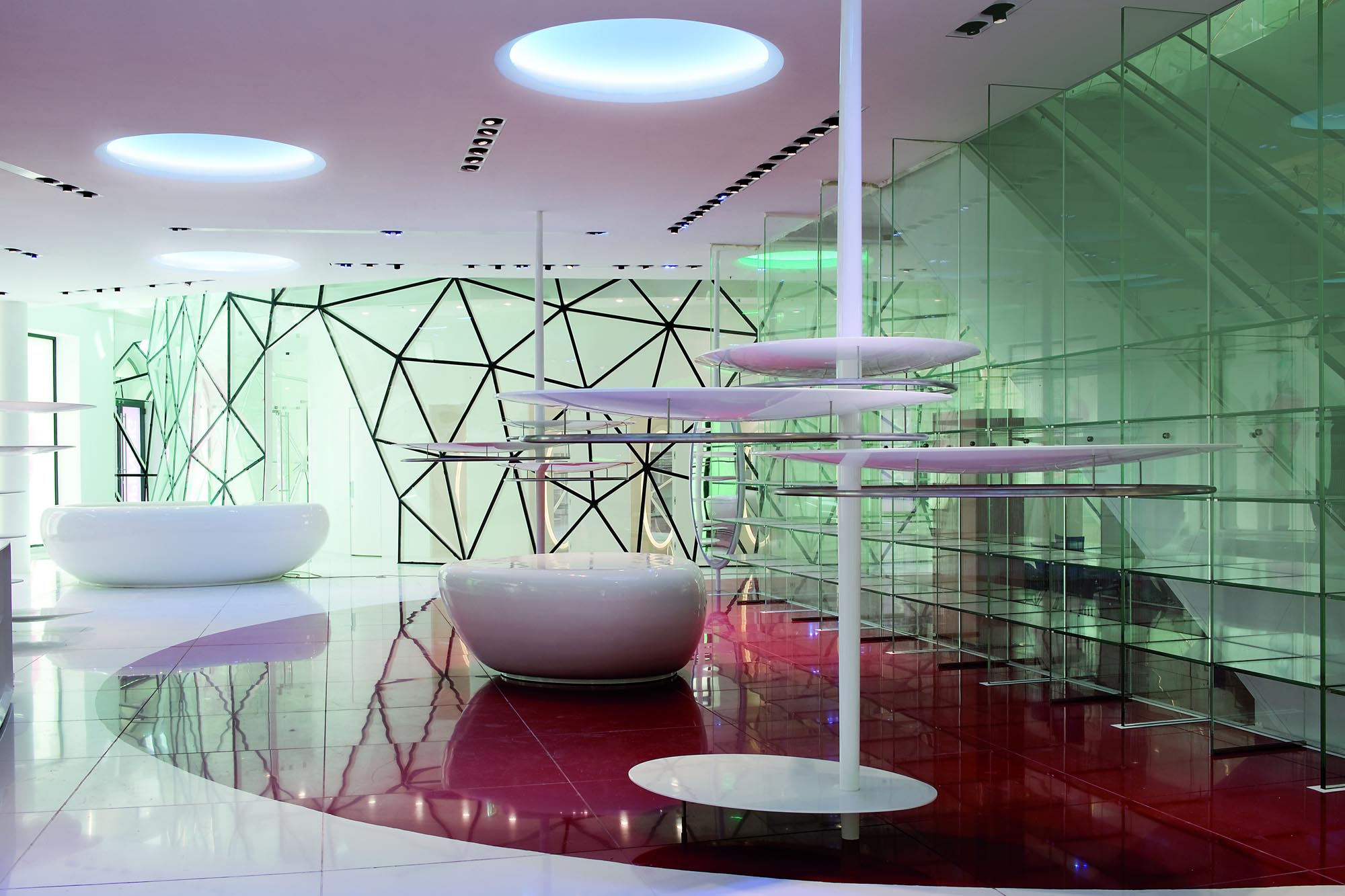 Un escalier avec des marches en verre éclairées par des LED et des surfaces réfléchissantes complète la décoration intérieure et relie les espaces. Enfin, un sol en verre au rez-de-chaussée permet de voir certains des vestiges archéologiques mis au jour lors des travaux.