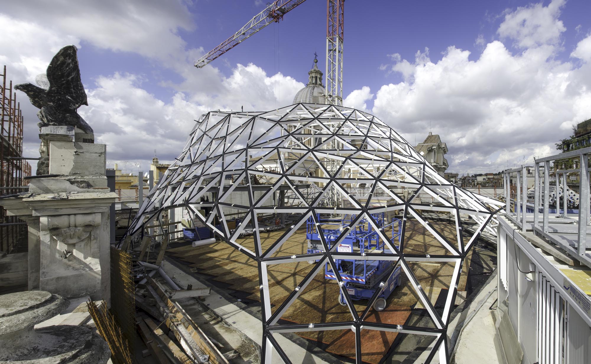 Un bâtiment peut-il aujourd'hui, de manière réaliste, constituer la perfection exacte d'un projet ? C'est possible si l'on considère la "Nuvola" et la "Lanterna" réalisées par Stahlbau Pichler pour Fuksas. La signature du Studio, le diamant de verre et d'acier à géométrie variable serti au sommet de l'ancien bâtiment de l'Union militaire, s'intègre parfaitement dans le centre historique de la capitale. Le projet dans son ensemble est une architecture qui dénonce sa propre époque, démontrant l'importance, même pour la Ville éternelle, de construire une modernité qui dialogue avec le passé, affirmant la valeur d'elle-même. Le Palazzo a été construit au début des années 1900 et compte quatre étages utilisés pour les activités commerciales. Le projet de récupération proposait deux approches : la lumière sur la peau du bâtiment, l'ingénierie pour la structure interne (appelée "Lanterna") et pour le toit (appelée "Nuvola").