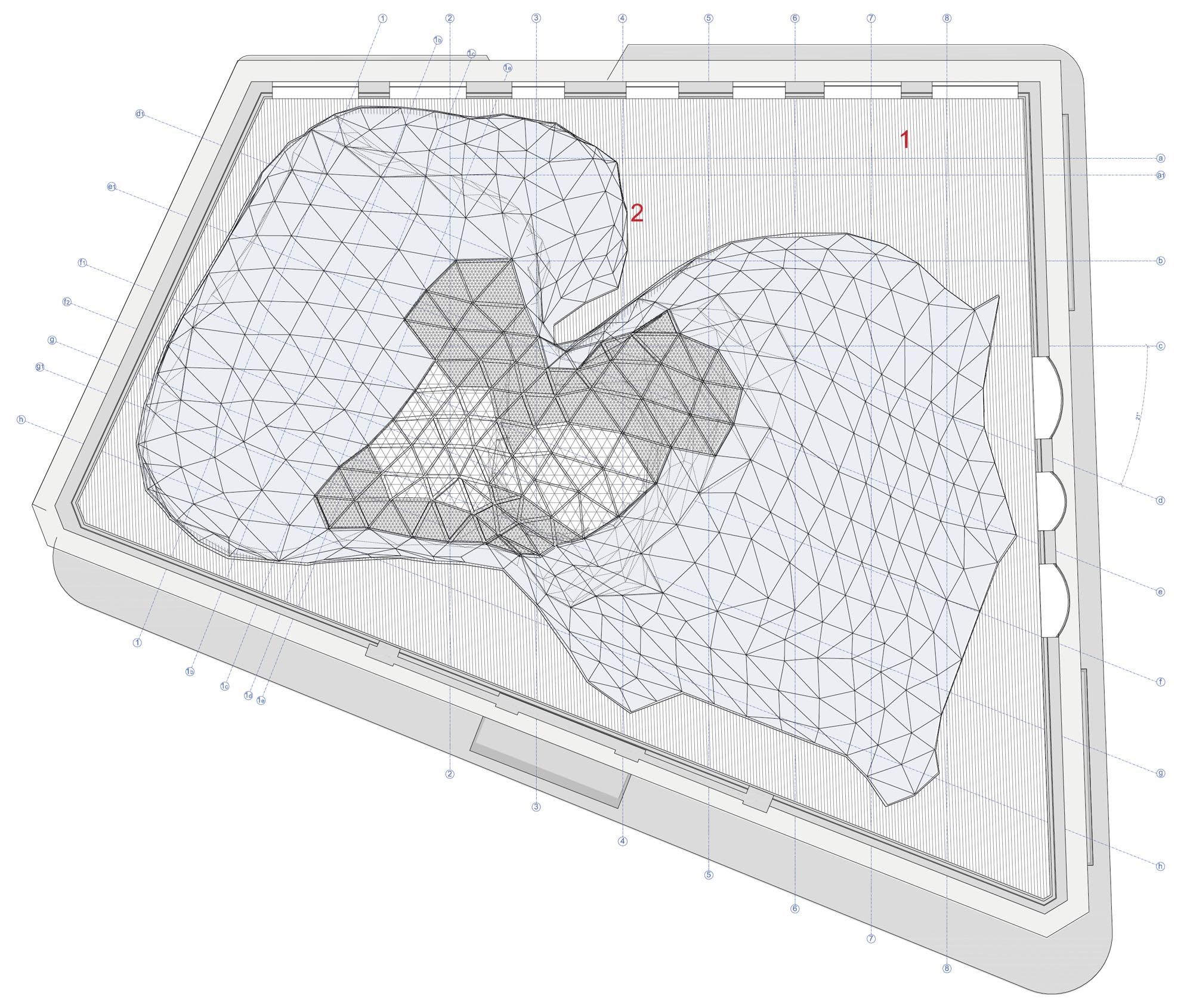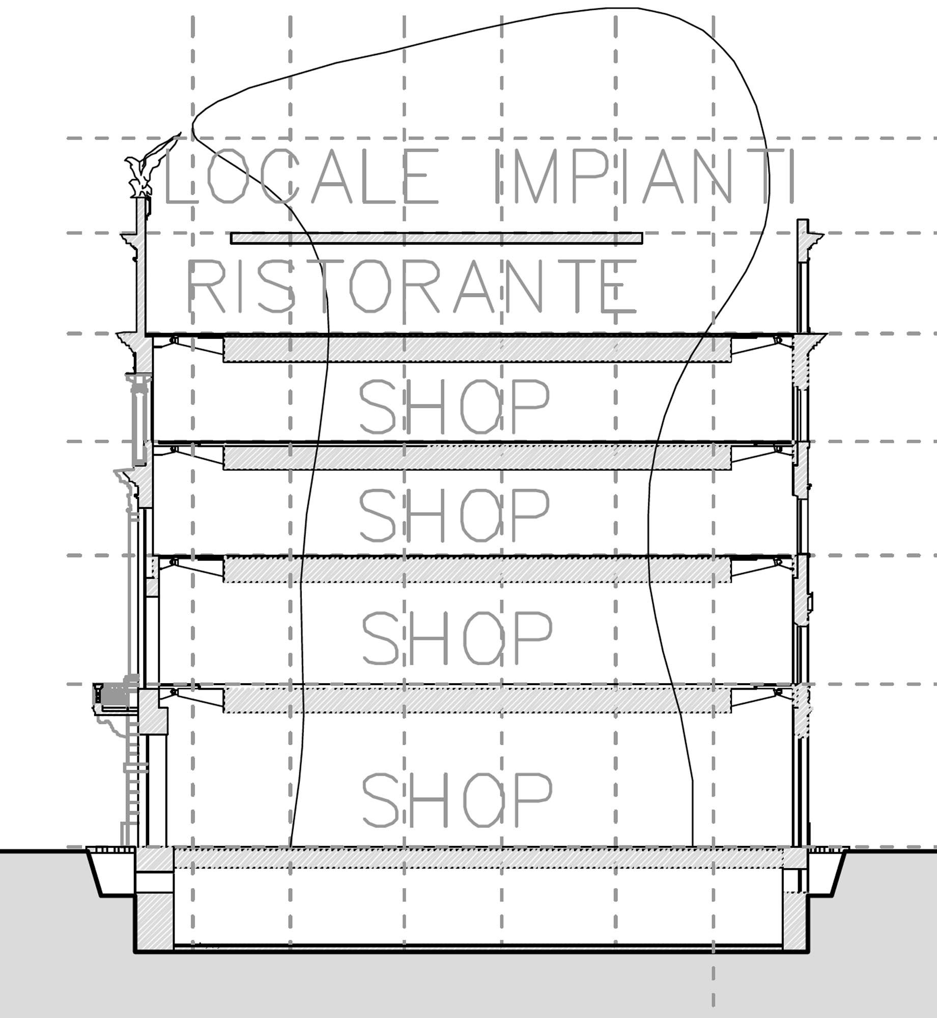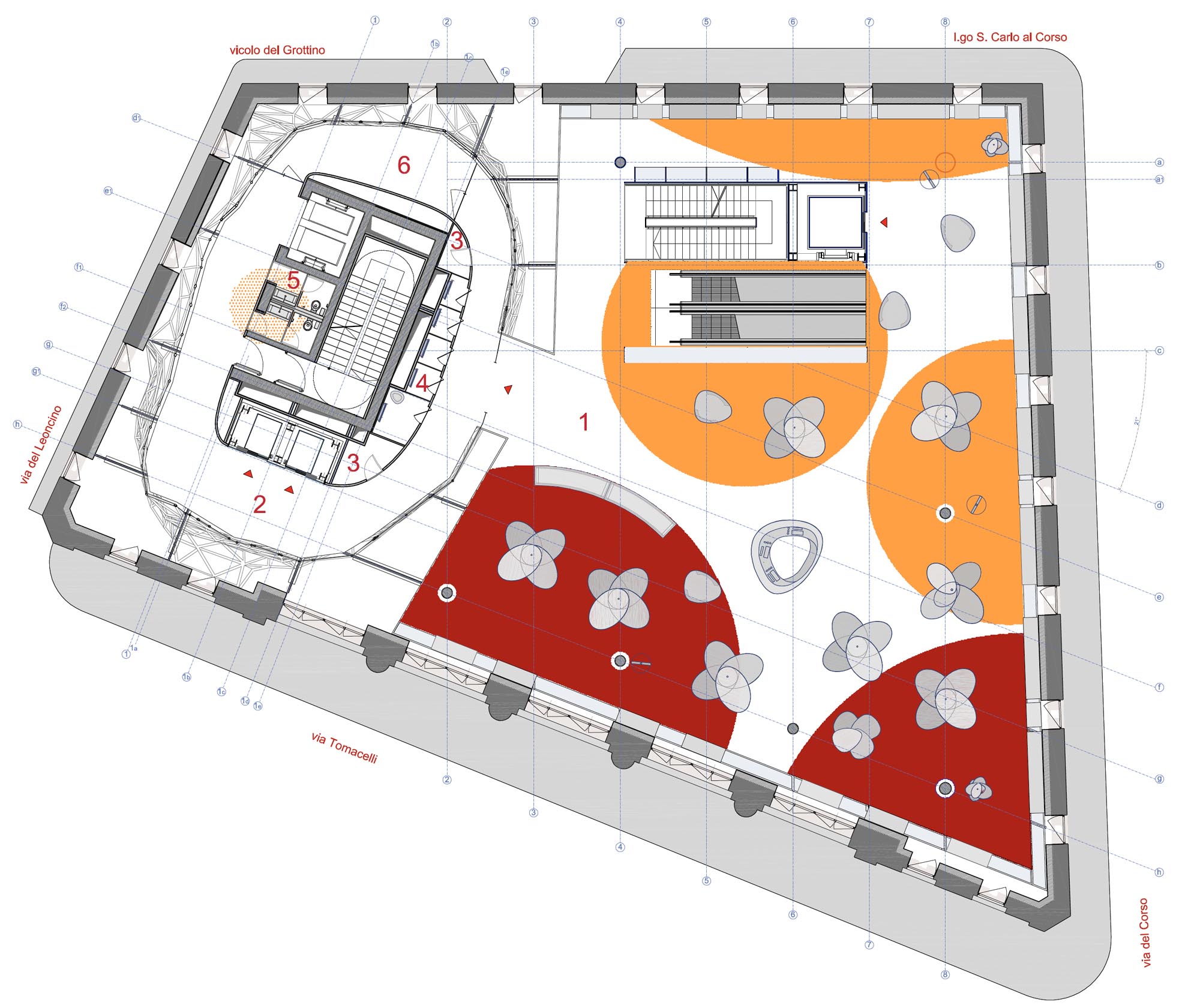 D'un point de vue architectural, la structure est immédiatement devenue un point de repère contemporain et un nom de lieu reconnu ; la nouvelle coupole est haute de 8 m et sa géométrie de base triangulaire contient des connexions verticales, des pièces de service, des pièces accessoires et une partie des systèmes. Le vide ainsi créé sur toute la hauteur permet de voir les différents étages, dont chacun ouvre au public un espace caractérisé par des sols décorés de "bulles" de tailles et de couleurs différentes, dans des tons de rouge, d'orange et de violet sur un fond blanc. Le rez-de-chaussée, conçu pour abriter un grand bazar, est également un espace ouvert et perméable qui relie la Via Tomacelli à la place adjacente. Le mobilier a également été conçu par le Studio Fuksas, principalement en fibre de verre et en privilégiant les lignes fluides.