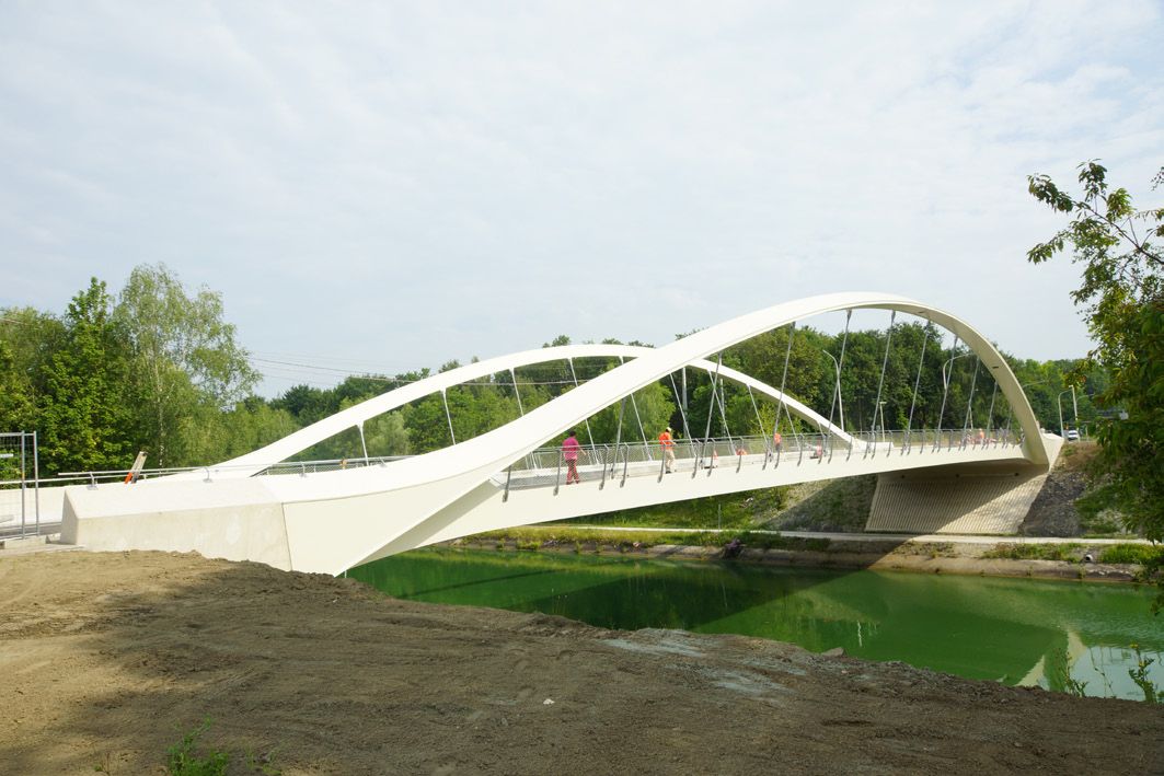 Le nouveau pont bow-string métallique a une portée de 68 m. Il prend appui sur deux culées en béton qui présentent un porte-à-faux dans la continuité du pont. L’ouvrage est un pont intégral. Il n’est donc pas nécessaire de placer des joints de dilatation entre le tablier du pont et les culées. Puisque cette typologie structurelle était une première en Région Wallonne, l’ouvrage a été instrumenté afin de suivre son comportement dans le temps