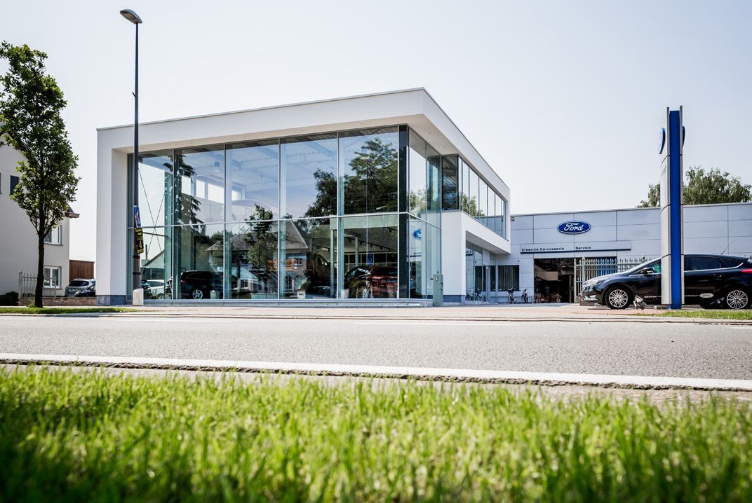 Design & Construction d’un garage Ford, un petit exemple unique de technique exécutée de manière polyvalente. La construction en acier dispose d’une mezzanine avec une portée libre de 15 m. Grâce au revêtement de façade (une combinaison de panneaux sandwich qui sont revêtus d’une couche de crépi isolée et de panneaux en silex noir), le bâtiment présente un design extrêmement épuré. Le steeldeck vient compléter le tableau.