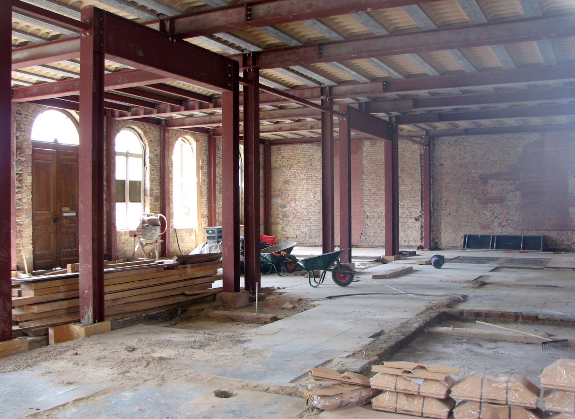 Pour la rénovation de la maison communale de Hoegaarden, seuls les quatre façades extérieures et le sous-sol avec ses voûtes en berceau devaient être conservés. La structure était en très mauvais état et tous les murs intérieurs, les planchers et le toit devaient être remplacés. En outre, l’entrepreneur redoutait l’ampleur des coûts qu’entraîneraient l’étayage des parois et le phasage des travaux de bétonage. C’est pour ces raisons que fut conçu un étayage en acier qui servirait par la suite de structure définitive. La première opération consista à introduire dans le bâtiment de nouvelles colonnes en acier par des ouvertures créées dans le toit. Les colonnes furent assujetties aux façades et au rez-de-chaussée au moyen d’étais diagonaux. Le plancher supérieur fut alors démonté, avant de placer la structure en acier de la nouvelle dalle. Il fut ensuite procédé de manière analogue pour les combles. Enfin, la structure du toit fut remplacée par une nouvelle charpente en acier.