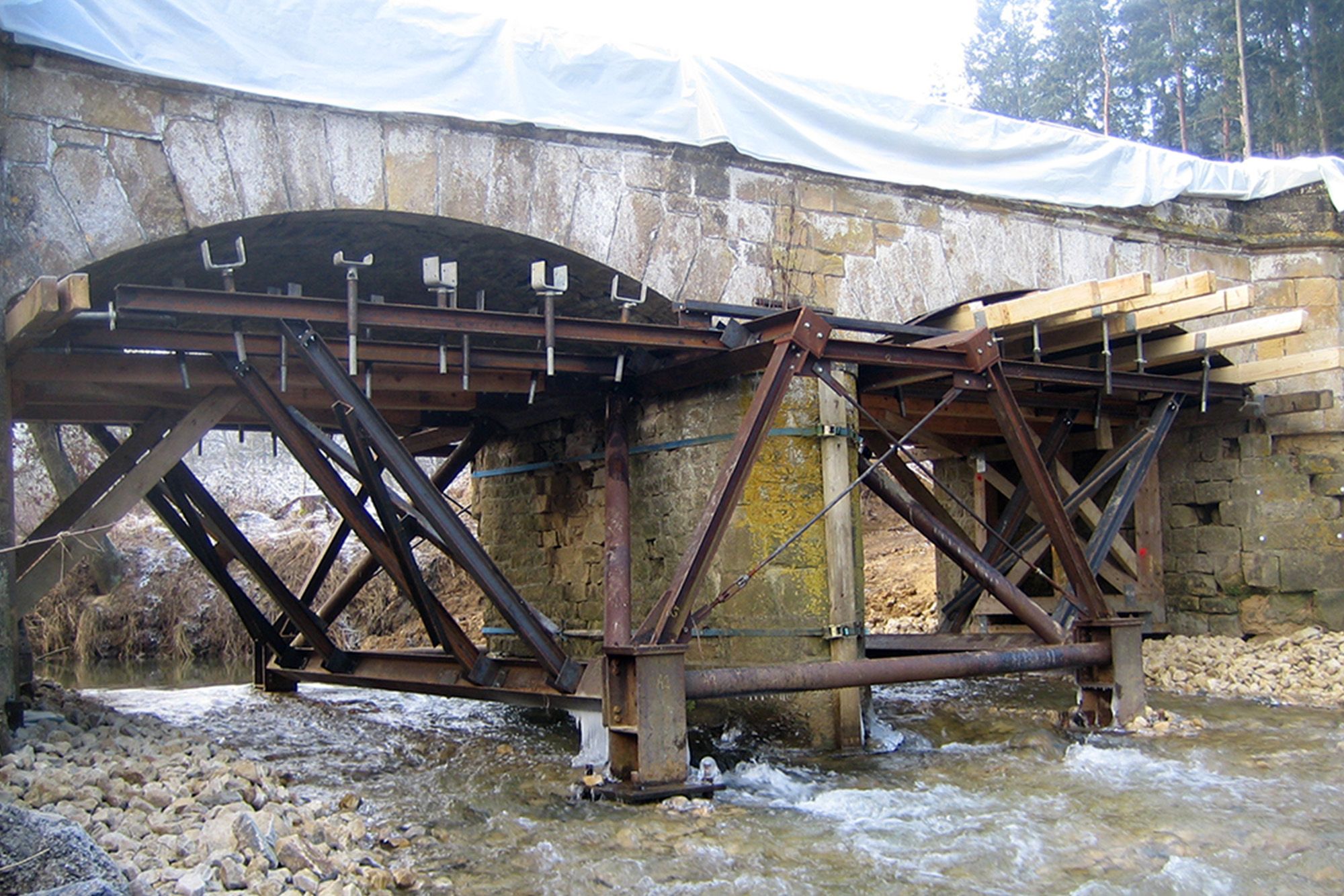 La décision prise fut de stabiliser d’urgence l’ensemble à l’aide d’une structure métallique placée dans le lit de la rivière. Le support métallique devait pouvoir reprendre le poids total du tablier et des voûtes en pierres naturelles durant le remplacement de la pile centrale. Puisque les éléments avaient seulement une fonction de stabilisation en phase chantier, la simplicité de mise en œuvre et leur coût étaient les seules contraintes.