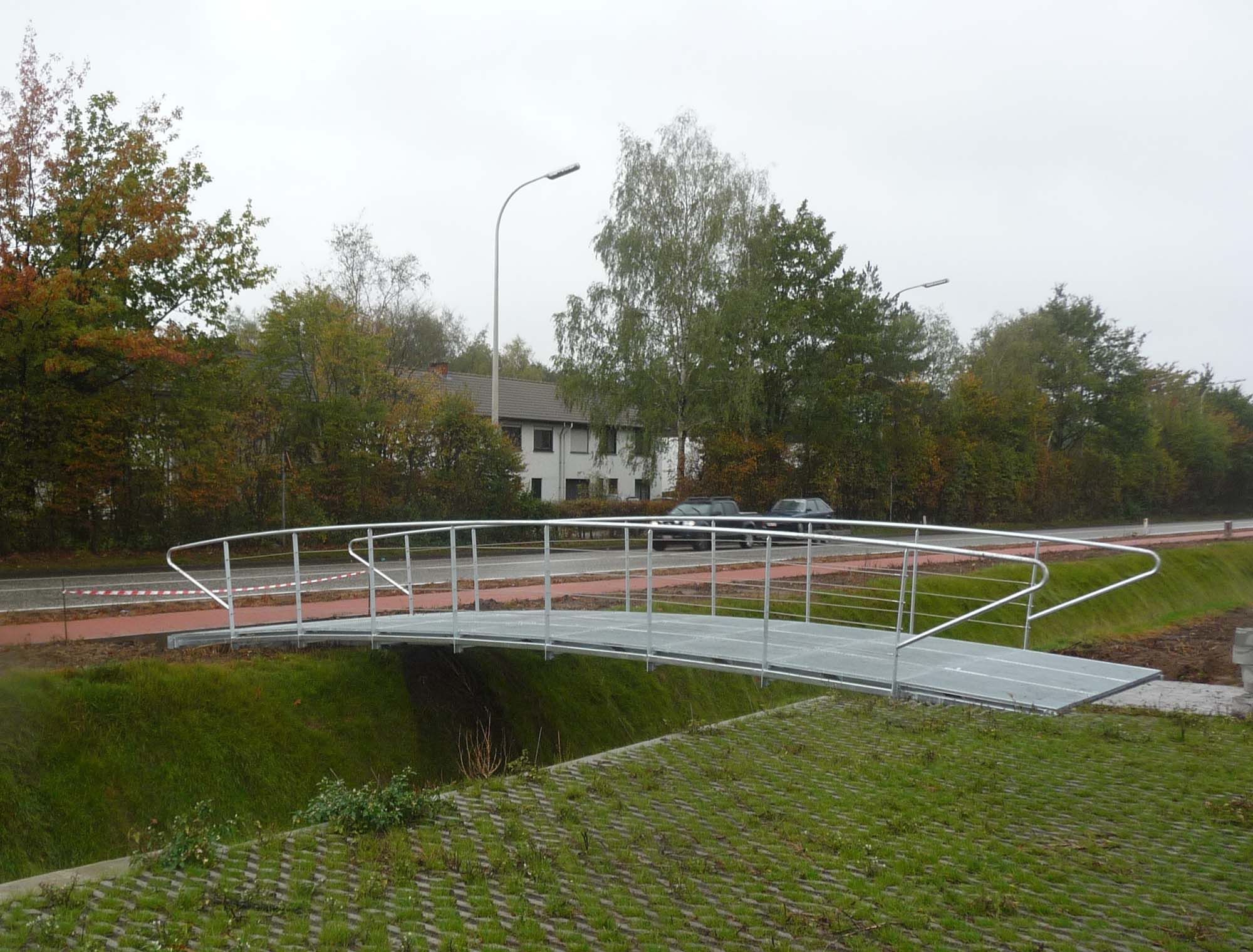 Pour assurer la liaison entre les terrains industriels et les bureaux de la caserne Lieutenant Coppens à Brasschaat, la commune souhaitait de petites passerelles légères. Pour satisfaire cette volonté, le choix s’est porté sur la conception de passerelles papillon. Les passerelles papillon ont une structure portante asymétrique en forme de papillon. Celle-ci reprend de manière optimale la charge uniforme et les efforts de torsion. La passerelle papillon est élégante et expressive et demande un minimum de matériau. Les portées peuvent aller jusqu’à 24 m. La structure en acier est galvanisée.