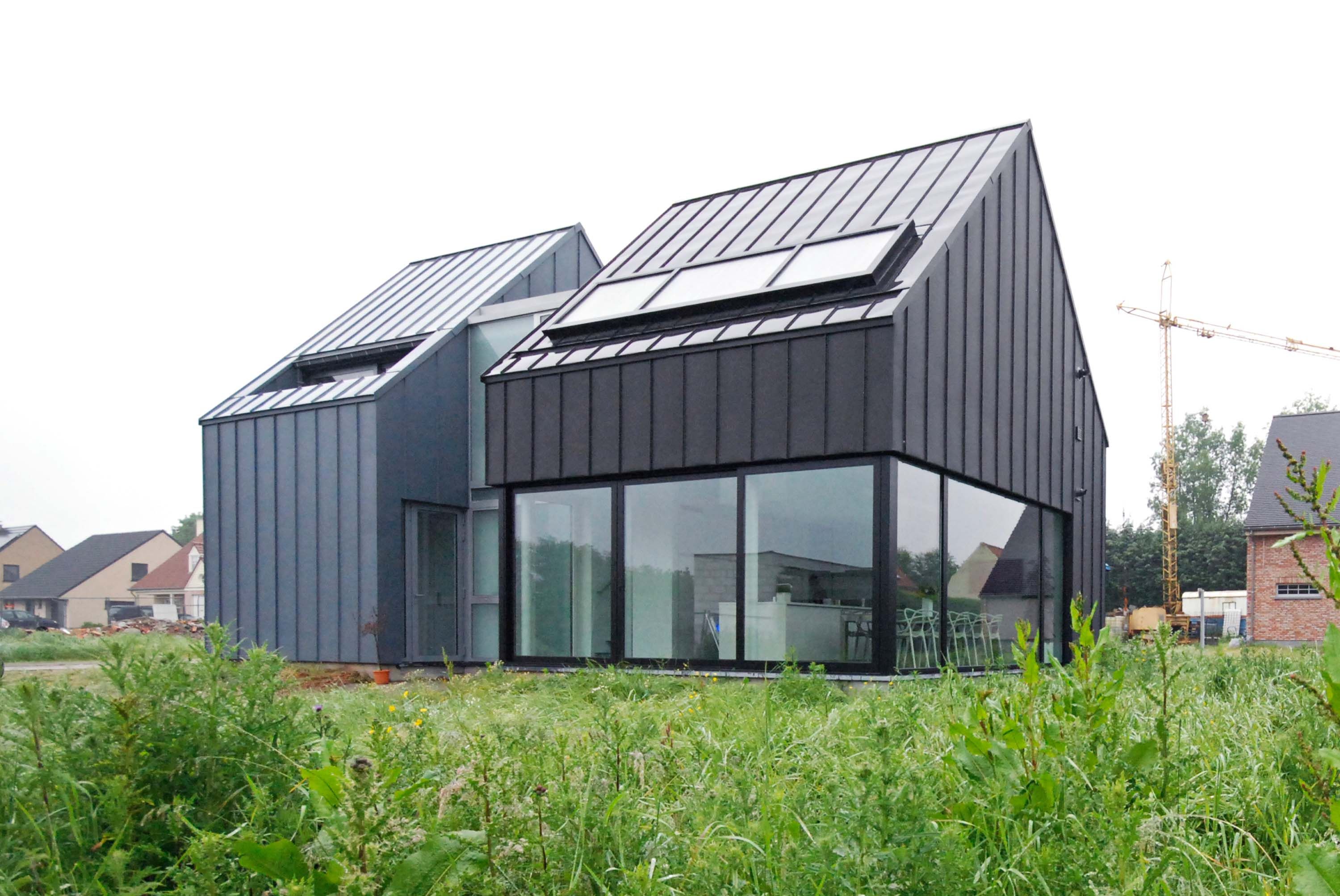 Vlakbij de fraaie natuur van Gavere treden twee volumes van zink in een boeiende architecturale dialoog. Samen vormen ze een knappe ééngezinswoning met een eenvoudig grondplan. De fris van de lever ontworpen woning is symmetrisch opgevat en bevat een woon- en een slaapgedeelte, die mooi van elkaar gescheiden zijn door de twee sprekende volumes van zink. De twee volumes, die van buitenaf doen denken aan een onafscheidelijke tweeling, zijn opgebouwd uit stalen draagconstructie. Het gelijkvloerse niveau biedt plaats aan een aparte ruimte voor kinderen en een keuken met een bijhorende eetruimte, terwijl de leefhoek en de woonkamer zich op de eerste verdieping bevinden en uitzicht hebben op de nabije natuur. Op de verdieping vinden we ook de ouderlijke slaapkamer met dakterras terug.