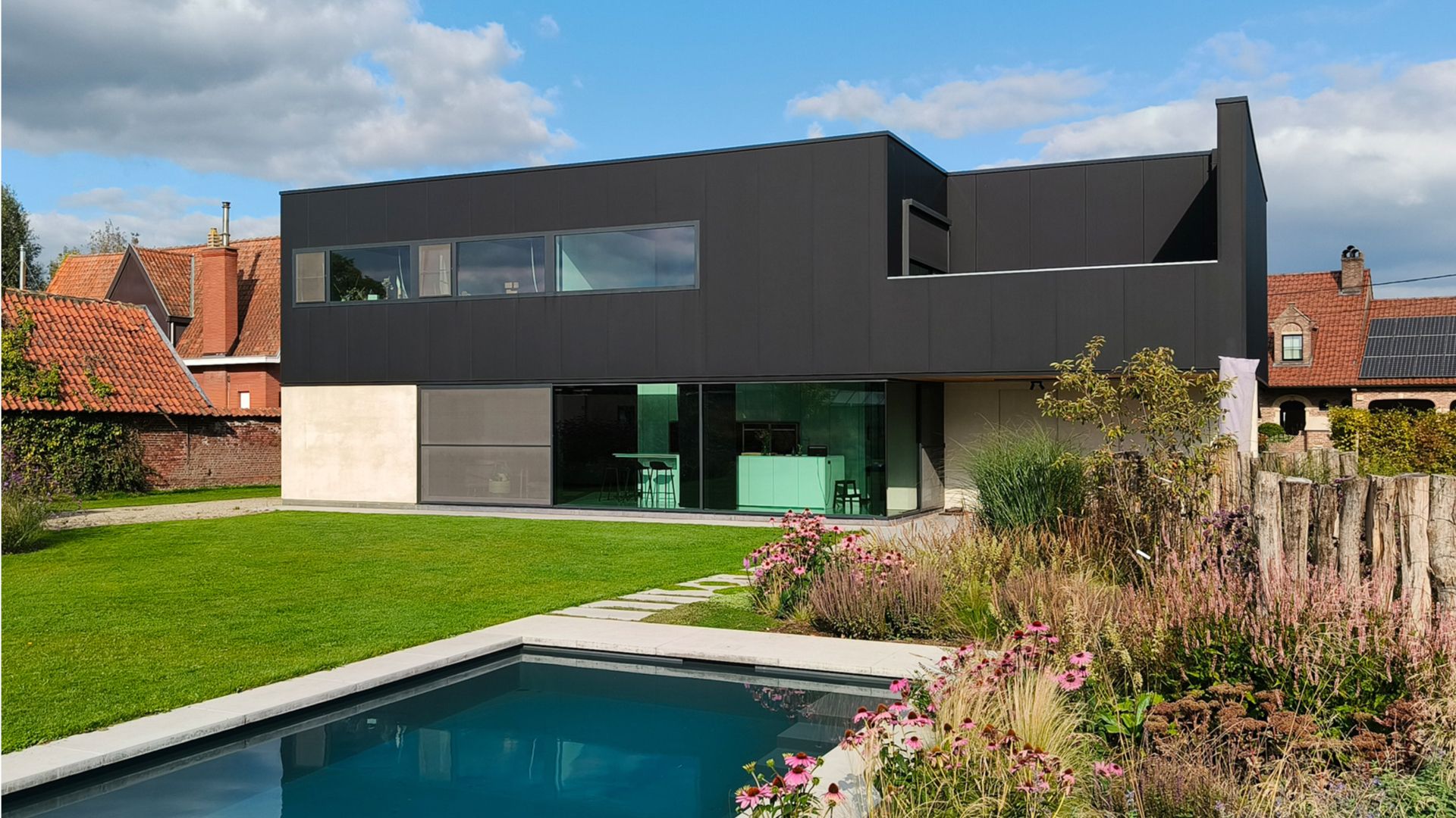 La juxtaposition du double carport à côté de la maison fait paraître cette maison à ossature métallique plus grande qu'elle ne l'est en réalité. La division horizontale en un socle et un volume de toiture relie la maison aux espaces extérieurs d'une part, et d'autre part réduit le volume du bâtiment, par ailleurs massif. Le volume du socle est fini avec des panneaux de béton lisse à l'avant, tandis que l'arrière est presque entièrement vitré. Le premier étage est revêtu de panneaux sandwich en acier de finition mate, gris foncé.