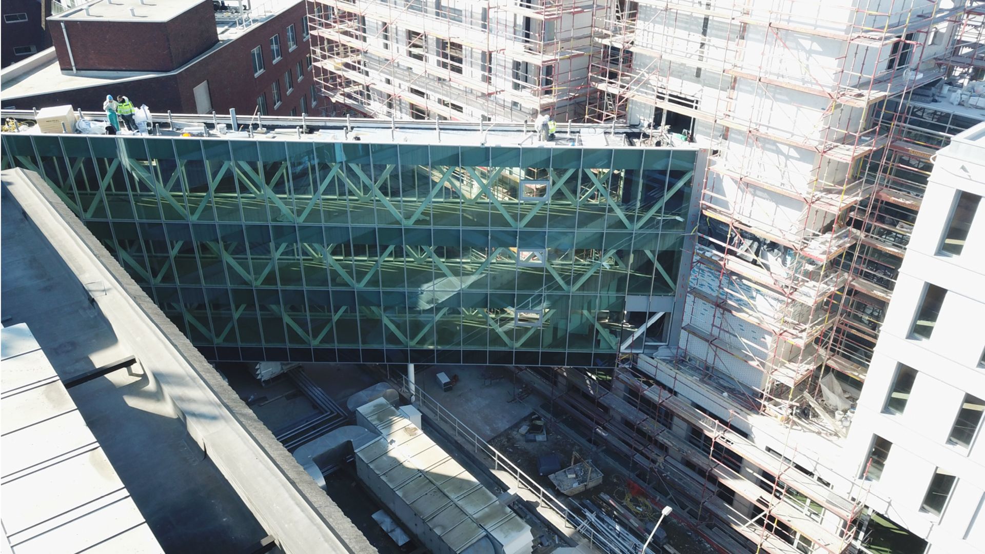 L'un des défis de la construction était d'intégrer la passerelle dans la structure existante. Ce problème a été résolu en appliquant un palier de glissement dans le bâtiment existant, tout en créant un point fixe dans le nouveau bâtiment. La bande de roulement de la passerelle consiste en un sol en béton, qui est fini pour former un espace intérieur à part entière, l'intégrant à la fois fonctionnellement et esthétiquement dans les installations de l'hôpital.