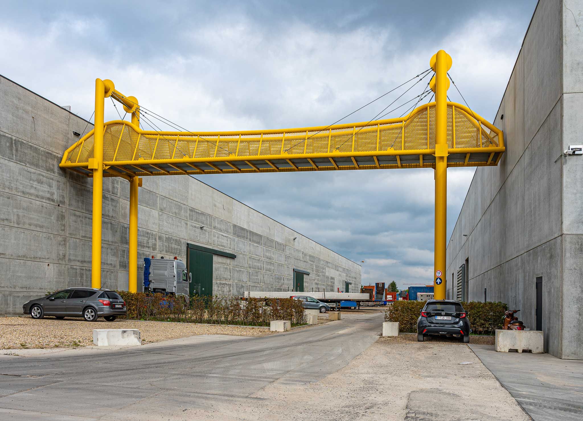 Ce pont à Heist-op-den-Berg est une liaison fonctionnelle entre deux bâtiments industriels et s'inspire du pont Parkbrug à Anvers. Le pont jaune lui-même se compose de seulement trois éléments : deux portiques de 12 m de haut et le pont proprement dit, long de 25 m. La couleur jaune a été choisie pour se démarquer des bâtiments industriels et servir de point de repère sur le site. Des animaux artistiques sont actuellement en cours de fabrication : lion, singe, etc. Ils seront par la suite placés sur le pont à des fins décoratives.