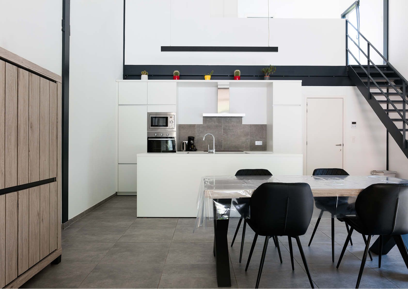 In een groene omgeving in het Belgisch-Nederlandse grensgebied maakte een vervallen woning plaats voor een moderne geïntegreerde tweewoonst. Beide huurwoningen moesten een industriële uitstraling en grote open leefruimtes hebben.
